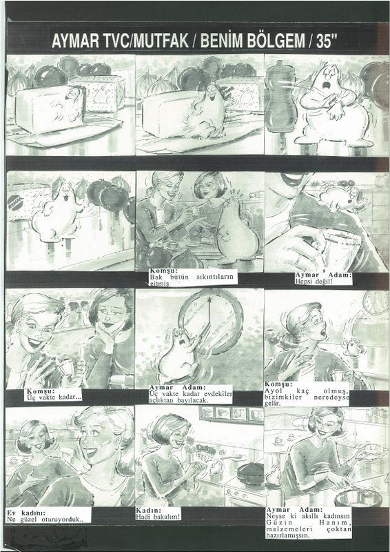 Tarihten yapraklar… Ayçiçek yağları, hele tuğla margarin tabir edilen katı yağlar bugün pek tercih edilmiyor. Bitkisel yağların revaçta olduğu 90lı yıllarda Unilever bünyesindeki Aymar için yaratılmış olan Aymar Adam, televizyon reklamlarının ilk reel-animasyon örneklerindendi ve döneminin ilgi çekici tiplemelerindendi. Paketten ya da şişeden Alaadin’in cini gibi çıkan, ev hanımlarına ilham verip arkadaşlık eden, çok bilmiş ve sevimli bir karakterdi. Mehmet Ali Erbil’in seslendirdiği bu damlacık Unilever çatısı altında “Fiyatı kalitesi var mı Aymar gibisi” jingle’ıyla en parlak dönemini yaşadı. %40lık pazar payıyla sektörün en önemli üreticisiydi ve uzunca bir süre televizyonları şenlendirmişti! Televizyon maceralarının yanında Aymar Adam basın, POP, outdoor kampanyalarıyla da hanımlarla kucaklaşmaya uzun süre devam etti. İlk televizyon reklamı tecrübelerimi yaşadığım Aymar’ı keyifle hatırlıyorum. Bu müthiş çizimli storyboad’ları da bu yüzden saklamıştım.