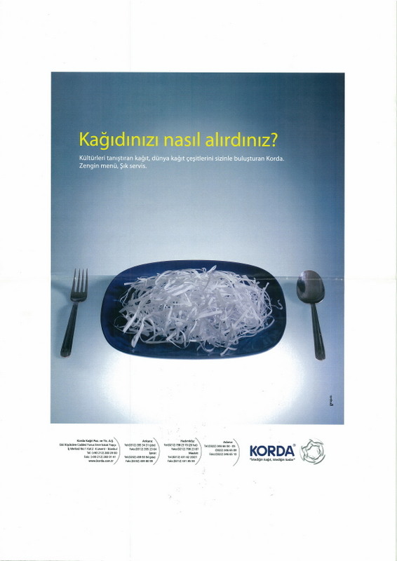 Ambalaj ve yayıncılık sektöründe faliyet gösteren firmalara kağıt tedarik eden Korda yerli ve yabancı ürün çeşitliliğinin yanında kesim ve depolama hizmetleri de sunuyor. Sektörel dergilerde yayınlanmış bir imaj kampanyası.